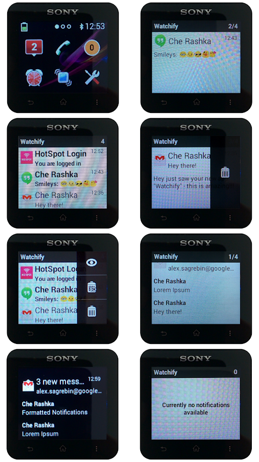 Soffre di alcune imprecisioni su Android 4.3 (se è presente una notifica pendente sul telefono,le nuove notifiche non vengono trasmesse allo SW2) che ho visto sparire una volta installato KitKat. Yeppa! Adesso devo dire che è perfetto!
