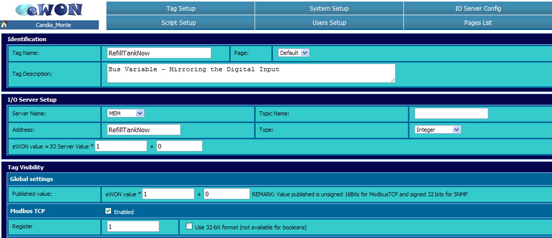 Nell'esempio che segue il TAG risiede in memoria, è di tipo intero e viene pubblicato su Modbus all'indirizzo 1.